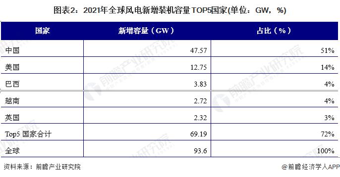 在全球風(fēng)電增速放緩的背景下,中國(guó)風(fēng)電裝機(jī)量有所回落。但 2021 年中國(guó)風(fēng)電新增裝機(jī)容量仍居全球第一,實(shí)現(xiàn)新增裝機(jī)容量 47.57GW,占全球新增裝機(jī)容量的 51%,其中陸上風(fēng)機(jī)裝機(jī)容量新增 30.67GW,海上風(fēng)機(jī)裝機(jī)容量新增 16.90GW; 其次為美國(guó),新增裝機(jī)容量 12.75GW,占比 14%,全為陸上風(fēng)機(jī) ; 巴西和越南緊隨其后,均占全球風(fēng)電新增裝機(jī)容量的 4%; 英國(guó)新增裝機(jī)量 2.32GW,占比也達(dá)到 3%。五大國(guó)共計(jì)新增裝機(jī)量 69.19GW,占全球新增裝機(jī)量比重約 72%。