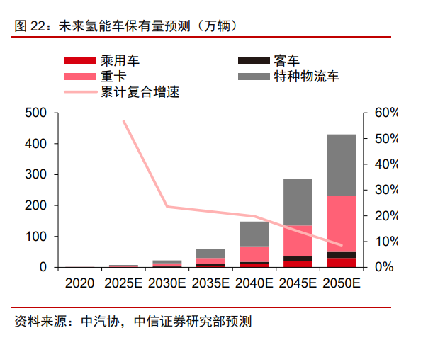 展望“十四五”,國內(nèi)氫能源車有望完成從產(chǎn)業(yè)導(dǎo)入期到量產(chǎn)的階段,結(jié)合各地方政府的氫能源規(guī)劃,我們預(yù)計2025年全國燃料電池車保有量有望達(dá)到8萬輛,其中預(yù)計乘用車、客車、重卡、物流車保有量將分別達(dá)到4500、10000、16000、47500輛左右,相應(yīng)的燃料電池需求預(yù)計將從目前的0.35GW左右上升至2025年的2.6GW;預(yù)計2050年燃料電池車保有量將達(dá)430萬輛。