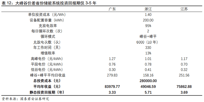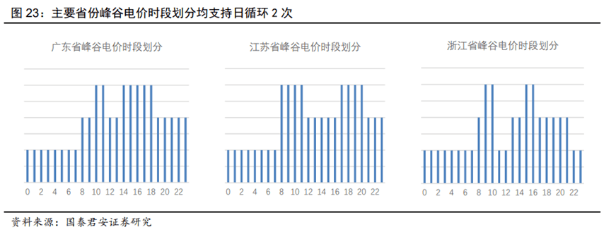 國內(nèi)用戶側(cè)的峰谷電價差套利,我們認為主要體現(xiàn)在小工業(yè)和商業(yè)。按照地區(qū)分布,主要是長三角和珠三角。儲能裝置的經(jīng)濟性體現(xiàn)在兩峰兩谷(平),每天可以有效充放電兩次的區(qū)域,比如廣東、浙江、江蘇等。