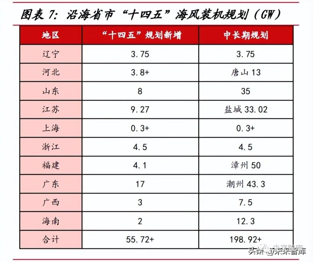 “十四五”規(guī)劃充沛,中長期發(fā)展可期。截至 2022 年,我國沿海省市已發(fā) 布“十四五”海上風電發(fā)展規(guī)劃,整體規(guī)劃新增裝機規(guī)模有望突破 55GW,2021- 22 年我國海風新增裝機約 21GW,對應 2023-25 年裝機規(guī)模約 34GW。考慮到部 分地區(qū)相關海風項目已實現(xiàn)平價上網,海風降本超預期,再結合廣東、山東、浙江 等地區(qū)已出臺地補政策支持海風建設,我們預計海風需求以及新增裝機或超過沿海 地區(qū)規(guī)劃規(guī)模,中性假設條件下,2023-25 年我國海風新增裝機規(guī)模有望超 40GW, 2023 年在行業(yè)充沛的招標量下,新增裝機規(guī)模有望達 10GW,同比實現(xiàn)翻倍增長。根據(jù)風芒能源統(tǒng)計,我國已出臺的海上風電規(guī)劃體量接近 200GW,中長期發(fā)展空 間廣闊。