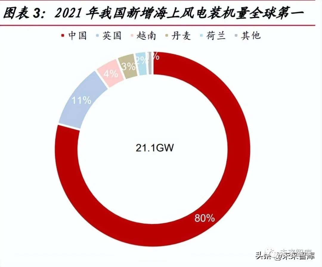 根據(jù) GWEC(全球風能協(xié)會)披露,2021 年我國新增風電裝機容量為 47.6GW, 占全球總風電新增裝機容量的 51%。海上風電方面,海上風電新增裝機量與累計裝 機量均位列全球第一。