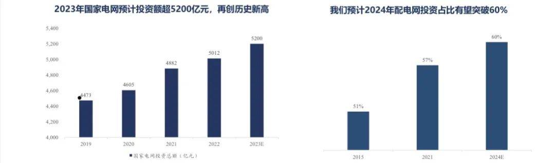 2019-2022年國家電網(wǎng)實現(xiàn)投資總額4473億元、4605億元、4882億元、5012億元,1月11日國家電網(wǎng)董事長辛保安在接受采訪時表示2023年將繼續(xù)加大電網(wǎng)投資,預(yù)計投資超5200億元,再創(chuàng)歷史新高,而電網(wǎng)投資結(jié)構(gòu)性特征突出,根據(jù)中電聯(lián)數(shù)據(jù),我國配電網(wǎng)的投資占比從2015年的51%提升至2021年57%。