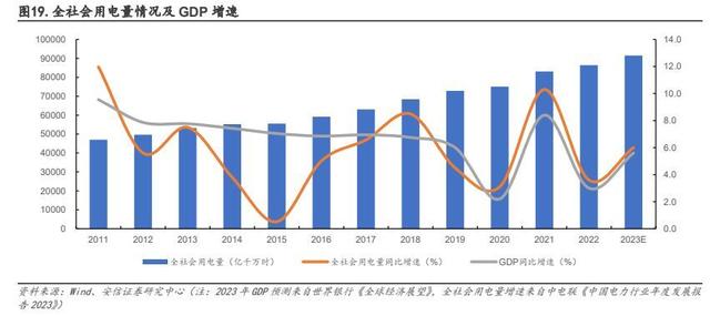 供給側(cè)改革“后遺癥”顯現(xiàn),階段性缺電頻發(fā)。2021 年以來的三年里,我國局部地區(qū)出現(xiàn)了電力供應(yīng)偏緊和短暫缺電的情況,先有 2021 年 8-9 月遼寧、吉林、江蘇、浙江、廣東等地相繼發(fā)布有序用電或限電通知,后有 2022 年夏季高溫天氣導(dǎo)致水電供應(yīng)持續(xù)受限,疊加居民用電負(fù)荷增加,各地為緩解用電高峰時段供電壓力再次發(fā)布限電通知,其中云南省電解鋁企業(yè)更是在 2022 年 9 月到 2023 年 2 月間三次收到限電通知。背后反映出來的是供給側(cè)改革后煤炭、火電的長期投資萎縮導(dǎo)致的產(chǎn)能不足現(xiàn)象,與此同時 2015 年后我國全社會用電量增速回升,疊加 2022 年極端高溫導(dǎo)致的空調(diào)降溫用電需求激增,電力供需的矛盾逐漸顯現(xiàn)。展望“十四五”后三年,根據(jù)《新形勢下“十四五”后三年中國電力需求形勢研判》(2023年發(fā)表)分析,“十四五”后三年中國用電量仍有較大增長空間,技術(shù)進步、能源轉(zhuǎn)型、電力市場、氣候氣溫等因素對用電增長影響將增強,且最大負(fù)荷受產(chǎn)業(yè)結(jié)構(gòu)調(diào)整、空調(diào)與電采暖設(shè)備推廣、氣候氣溫等影響將更為突出,增速將高于用電增速,或進一步增大電力保供壓力。