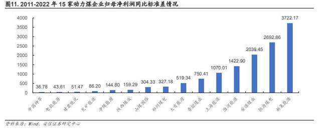 2)抵御周期方面,中國神華的煤電一體也一定程度熨平了煤、電行業(yè)周期波動,2011-2015年,受經(jīng)濟增長動能弱化、煤炭行業(yè)產(chǎn)能逐漸過剩影響,煤價整體波動向下,同時期公司煤炭分部毛利率由 32%下降至 16%,而發(fā)電分部因成本改善毛利率由 24%上升至 36%。根據(jù)中國煤炭協(xié)會的統(tǒng)計,2015 年煤炭行業(yè)虧損面已超過八成,而中國神華依舊實現(xiàn)歸母凈利潤161.44 億元,凈利率 13.14%,位列當(dāng)年動力煤(中信)板塊公司榜首。2021-2022 年在火電企業(yè)大幅虧損的局面下,公司發(fā)電分部憑借穩(wěn)定煤源依舊實現(xiàn)毛利率 7.7%和 14.3%。在此基礎(chǔ)上,中國神華的煤炭業(yè)務(wù)與發(fā)電業(yè)務(wù)形成良好對沖,一定程度加強了業(yè)績的穩(wěn)定性。我們選取 Wind 中主業(yè)為動力煤的 15 家上市公司作為樣本,計算其 2011-2022 年歸母凈利潤同比變動標(biāo)準(zhǔn)差。結(jié)果顯示中國神華的同比變動標(biāo)準(zhǔn)差最小,側(cè)面反映其盈利穩(wěn)定性。此外,據(jù)《煤電一體化深度融合發(fā)展的國神路徑研究》(2020)的分析,國家能源集團旗下國神公司的煤電一體化項目除了通過傳統(tǒng)方式建設(shè)坑口電廠,減少煤炭流通環(huán)節(jié)實現(xiàn)內(nèi)部降本外,還通過水汽互補利用,燃料經(jīng)濟摻燒等創(chuàng)新方式降低生產(chǎn)成本,提高產(chǎn)業(yè)協(xié)同效應(yīng)。
