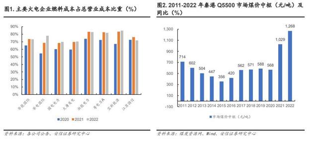 據(jù)煤炭資源網(wǎng),2021 年秦皇島港動力煤 Q5500 平倉價中樞達到 1029 元/噸,較 2020 年價格中樞 568 元/噸上漲約 81%。2022 年,在俄烏沖突、極端高溫天氣、煤炭新增產(chǎn)能釋放有限等多重因素影響下,煤價持續(xù)高位運行,秦皇島港動力混煤 Q5500 平倉價全年價格中樞抬升至1268 元/噸,同比提高約 23%,直接導(dǎo)致 2021-2022 年火電企業(yè)燃料成本占比大幅提升,火電企業(yè)業(yè)績承壓。