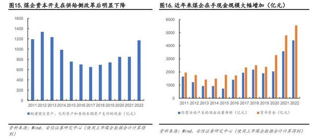 “雙碳”目標(biāo)下,煤企轉(zhuǎn)型具備先天產(chǎn)業(yè)優(yōu)勢、地域優(yōu)勢且資金充足。一方面,煤企具有產(chǎn)業(yè)優(yōu)勢,具備能源開采、裝備制造的成熟經(jīng)驗,擁有穩(wěn)定的下游電廠、化工客源,以及先天地域優(yōu)勢。我國大型新能源項目基地多數(shù)位于西北地區(qū),與煤炭資源分布重合度較高,如我國第一批容量約 1 億千瓦的大型風(fēng)電光伏基地主要位于甘肅、青海、內(nèi)蒙、寧夏等西部地區(qū)。此外,與傳統(tǒng)能源相比,新能源占地面積大。隨著新能源規(guī)??焖贁U大,土地資源已經(jīng)成為影響新能源發(fā)展的重要因素,煤炭企業(yè)可利用自有采煤沉陷區(qū)受損土地規(guī)劃建設(shè)光伏發(fā)電、風(fēng)力發(fā)電等新能源項目,提高資源利用率的同時還可實現(xiàn)綠色轉(zhuǎn)型。另一方面,受制于 2011-2013 年行業(yè)產(chǎn)能過剩以及 2016 年以來的供給側(cè)結(jié)構(gòu)性改革,煤炭行業(yè)資本開支明顯下降,2021 年至今雖在行業(yè)景氣度好轉(zhuǎn)以及政策鼓勵保供穩(wěn)價背景下有所回升,但在“雙碳”目標(biāo)持續(xù)推進下,煤炭固定資產(chǎn)投資規(guī)模大、時間長,資本開支仍低于此前水平,且新礦井的使用時間一般長達數(shù)十年之久,長期來看與雙碳背景相違背,企業(yè)進行煤炭固定資產(chǎn)投資的意愿不強。但近兩年煤價高位運行,使得煤炭企業(yè)盈利能力持續(xù)改善,在手現(xiàn)金規(guī)模大幅增加,為后續(xù)轉(zhuǎn)型提供基礎(chǔ)。