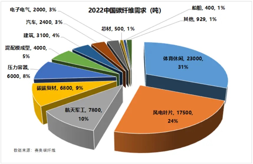 從量上看,現(xiàn)在碳纖維的市場(chǎng)并不大。根據(jù)賽奧碳纖維的數(shù)據(jù),2022年全球碳纖維需求量是13.5萬(wàn)噸,中國(guó)的年需求量是7.44萬(wàn)噸,占到一半以上。