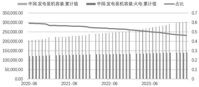 截至2024年5月,全國電力裝機容量為30.3733億千瓦,其中火電裝機容量為14.0113億千瓦,占比46.1303%,這是繼2023年7月火電裝機容量占比跌破50%后持續(xù)下降的表現。這較2020年9月提出“雙碳”目標時58.6762%的占比下降了12.6649個百分點。