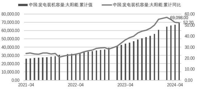從光伏發(fā)電裝機容量和增速走勢可以看出,2021年以來一直以20%以上的速度增長,2023年年末增速達到55.20%,裝機總量達到6.0949億千瓦,較2022年年末增加21685萬千瓦。截至2024年5月底,光伏發(fā)電裝機容量達到6.9098億千瓦,較2023年年底增加8149萬千瓦,同比增速為52.20%。