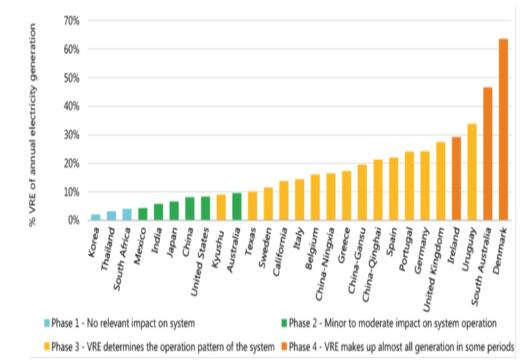 圖1 不同國家/地區(qū)波動性可再生能源發(fā)電占比及相應(yīng)的系統(tǒng)集成階段(2018年)