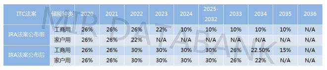美國IRA法案出臺(tái),獨(dú)立儲(chǔ)能納入ITC補(bǔ)貼范圍,并將ITC補(bǔ)貼有效期將持續(xù)到2033年,并將抵免劃分為基礎(chǔ)抵免+額外抵免。其中基礎(chǔ)抵免額度由之前的26%上升至30%,此前為逐年退坡。具體變化情況如下表:
