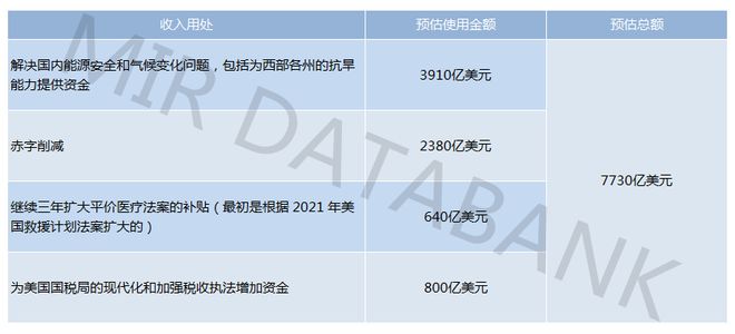 IRA法案的實(shí)施是政治家們的游戲,但透過政治博弈的波譎云詭,人們更關(guān)心的是法案本身到底在傳達(dá)什么信息。簡單來說,IRA法案旨在通過減少赤字、降低處方藥價(jià)格、投資國內(nèi)能源生產(chǎn)以及促進(jìn)清潔能源產(chǎn)業(yè)來遏制通膨。以上的想法是偉大的,但是美國目前國家債務(wù)高筑,聯(lián)邦政府連年擴(kuò)大赤字,美國的國家總債務(wù)限額屢屢被觸及,需要提高債務(wù)上限。這項(xiàng)宏大的新能源投資刺激法案的錢從哪來?又被具體分配到哪些領(lǐng)域? 這些問題由MIR睿工業(yè)通過對(duì)法案原文的解讀總結(jié)出下列圖表: