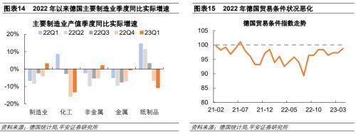 德國(guó)能源密集型行業(yè)受到的產(chǎn)出沖擊在2022年第4季度凸顯,化工和紙制品行業(yè)受到的影響尤甚。采用德國(guó)批發(fā)價(jià)格指數(shù)進(jìn)行平減,可以看到在2022上半年,德國(guó)制造業(yè)產(chǎn)出整體上受高通脹的嚴(yán)重沖擊,但能源密集型行業(yè)的產(chǎn)出表現(xiàn)存在差異,化工和紙制品行業(yè)甚至出現(xiàn)了逆勢(shì)增長(zhǎng)。德國(guó)能源價(jià)格漲幅最大的是2022年第3季度,此時(shí)能源密集型行業(yè)已經(jīng)出現(xiàn)了較為明顯的實(shí)際產(chǎn)出下降??紤]到可能存在一定的庫存消耗和價(jià)格粘性等帶來的滯后影響,2022年4季度德國(guó)能源密集型行業(yè)產(chǎn)出受到的沖擊進(jìn)一步加大,尤其是化工行產(chǎn)出同比實(shí)際增速下降15.7%,出現(xiàn)了較大調(diào)整;金屬制品、紙制品和非金屬制品也分別下降了6.8%、6.6%和5.1%,均高于制造業(yè)整體降幅4.1%。2023年第1季度,隨著能源價(jià)格快速回落,德國(guó)整體制造業(yè)產(chǎn)出同比實(shí)際增長(zhǎng)3.1%,但化工和紙制品行業(yè)分別同比實(shí)際下降13.2%和10.8%,拖累依然嚴(yán)重。從德國(guó)貿(mào)易條件指數(shù)來看,2021年以來德國(guó)貿(mào)易條件指數(shù)震蕩走低,尤其是在2022年能源價(jià)格走高后,貿(mào)易條件指數(shù)加速下滑,于2022年8月降至低點(diǎn)89.3%,即使之后恢復(fù)增長(zhǎng),截至2023年4月仍然小于100。貿(mào)易條件指數(shù)的惡化充分反映了本輪能源危機(jī)對(duì)德國(guó)貿(mào)易的負(fù)面沖擊。