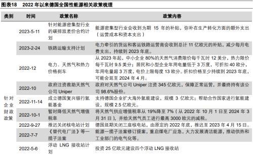一是,大力投資可再生能源行業(yè),減少對(duì)石化能源的依賴。德國(guó)一直謀求能源轉(zhuǎn)型,希望實(shí)現(xiàn)能源自主。德國(guó)在2022年1月份起大力投資新能源汽車和相關(guān)基礎(chǔ)設(shè)施,2月23日提前減免可再生能源附加稅,7月德國(guó)聯(lián)邦會(huì)議上通過了一攬子能源轉(zhuǎn)型法案(包括《可再生能源法》、《陸上風(fēng)電法》、《替代電廠法》、《聯(lián)邦自然保護(hù)法》等),11月成立氫能基金,大力建設(shè)本國(guó)企業(yè)海外氫能產(chǎn)業(yè)鏈和其它國(guó)家氫能產(chǎn)業(yè)鏈。