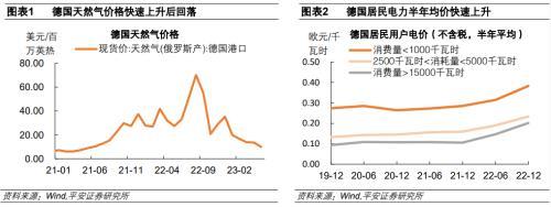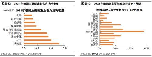 德國(guó)電力消耗密集型行業(yè)主要是紙制品、化工、基本金屬和非金屬制品等,也是工業(yè)品價(jià)格通脹較嚴(yán)重的行業(yè)。將行業(yè)電力消耗規(guī)模比上行業(yè)總產(chǎn)出,可以得到該行業(yè)的電力消耗密集度。德國(guó)紙制品行業(yè)的電力密集程度較高,每1歐元的產(chǎn)出需要投入0.51KWh的電力,化工、基本金屬和非金屬制品行業(yè)的電力密集度分別為0.4、0.36和0.33KWh/歐元。使用歐元區(qū)主要制造業(yè)PPI同比增速來衡量德國(guó)制造業(yè)的通脹形勢(shì),可以看到2022年P(guān)PI同比最高的是焦炭和石油行業(yè),漲幅高達(dá)56.7%;電力消耗密集度較高的紙制品、化工、基本金屬和非金屬制品行業(yè)通脹程度也較高,其PPI同比分別為26.6%、29.9%、26.6%和16.7%。