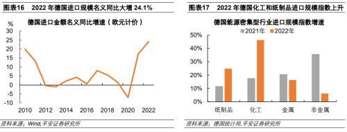 德國(guó)通過大量進(jìn)口能源密集型產(chǎn)品來彌補(bǔ)本國(guó)產(chǎn)能缺口,體現(xiàn)為2022年德國(guó)化工品和紙制品進(jìn)口規(guī)模指數(shù)大幅上升。2011年以來,德國(guó)進(jìn)口規(guī)模較為穩(wěn)定。2021年德國(guó)進(jìn)口規(guī)模增長(zhǎng)17.3%,2022年德國(guó)進(jìn)口規(guī)模大幅增長(zhǎng)24.1%。從能源密集型行業(yè)來看,剔除價(jià)格因素后,2022年化工和紙制品進(jìn)口規(guī)模指數(shù)大幅上升,分別增長(zhǎng)46.4%和24.8%,金屬和非金屬2022年進(jìn)口增速則低于2021年增速。
