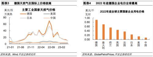 橫向比較來看,德國(guó)天然氣價(jià)格在主要工業(yè)國(guó)家中處于較高水平,德國(guó)企業(yè)電力價(jià)格在2022年底全球最高。主要工業(yè)大國(guó)中,德國(guó)和日本在天然氣供給方面較為相似,二者的天然氣價(jià)格走勢(shì)十分接近,在2022年中天然氣價(jià)格大幅攀升,并于近期價(jià)格出現(xiàn)了回落。但中美的天然氣價(jià)格則較為穩(wěn)定,德國(guó)天然氣價(jià)格在2022年8月最高峰時(shí)分別是美國(guó)和中國(guó)天然氣價(jià)格的8倍和16倍。德國(guó)電力價(jià)格在2022年底達(dá)到了全球最高的0.91美元/千瓦時(shí),遠(yuǎn)高于日本、美國(guó)和中國(guó)0.23、0.15和0.09美元/千瓦時(shí)的電價(jià)。這引發(fā)市場(chǎng)對(duì)于德國(guó)制造業(yè)發(fā)展高度的擔(dān)憂。