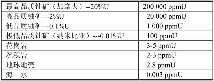 鈾在土壤、巖石及河流、海洋都可發(fā)現(xiàn);甚至在人體和食品中都有痕跡量存在。但是濃縮的鈾礦卻只在很少的地方發(fā)現(xiàn),一般是在堅(jiān)硬的巖石中,如在地殼中占60%的花崗巖中,其鈾含量可達(dá)百萬(wàn)分之四。