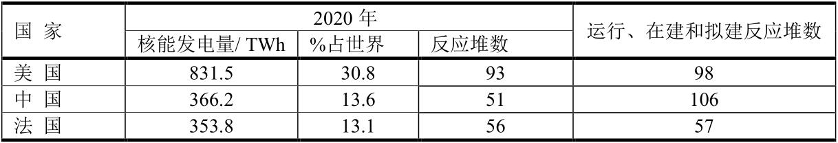 表中“%e”表示核能發(fā)電占發(fā)電總量的百分率。全球核能發(fā)電占全球發(fā)電總量的10.1%,其中法國(guó)高達(dá)70.6%。本數(shù)據(jù)是世界核能協(xié)會(huì)WNA 2021年1月份提供的數(shù)據(jù)。