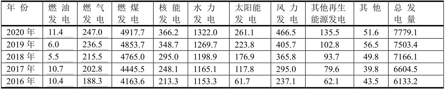 就中國(guó)發(fā)電而論,2020年燃煤發(fā)電居首位,占中國(guó)發(fā)電總量的4917.7/7779.1=63.2%;其次為水力發(fā)電、風(fēng)力發(fā)電、核能發(fā)電和太陽能發(fā)電。盡管中國(guó)燃?xì)獍l(fā)電量居世界第三位,但在中國(guó)發(fā)電總量中居第六位247.0/7779.1=3.2%。