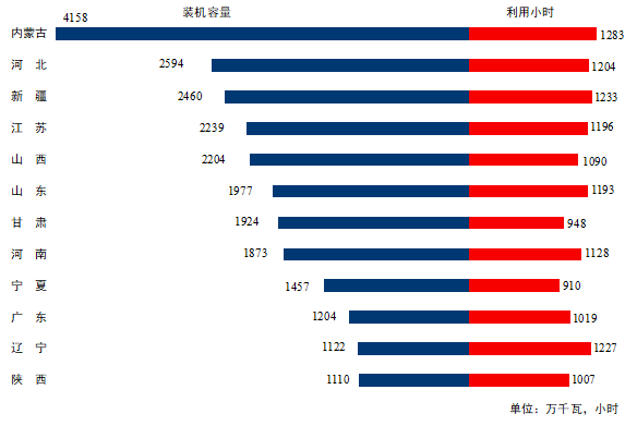 圖3 1-6月份風(fēng)電裝機(jī)較多省份風(fēng)電裝機(jī)容量和設(shè)備利用小時(shí)