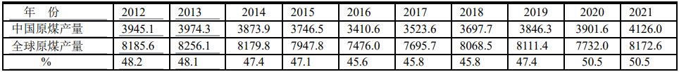 根據(jù)BP 2022的報(bào)告,全球原煤產(chǎn)量在逐年降低,而中國(guó)原煤產(chǎn)量卻在逐年增高,占全球原煤總產(chǎn)量的比例也隨之逐年增加。參見(jiàn)下表。