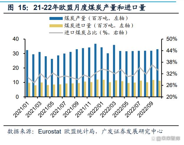 電煤需求降低、庫存增加,歐盟增量煤炭需求或?qū)⑾禄?022年歐盟電煤消費量增 加帶動煤炭消費量提升,1-8月電煤消費量同比提升16.2%,煤炭消費量同比提升 8.8%,非電煤消費量同比下降5.1%;9月后電煤消費量同比出現(xiàn)下滑,與煤電發(fā)電 量走勢一致,9月、10月電煤消費量分別同比下降0.9%、2.6%,煤炭消費量同比下 滑5.1%、6.6%。從煤炭供給量和消費量對比來看,2021年歐盟煤炭產(chǎn)量+進口量僅 超出煤炭消費量163萬噸,2022年,歐盟增加煤炭供給量,1-10月煤炭產(chǎn)量+供給量 合計4.32億噸,而消費量為4.15億噸,增加庫存1721萬噸,庫存增加、需求降低將 導致2023年歐盟增量煤炭需求下滑。