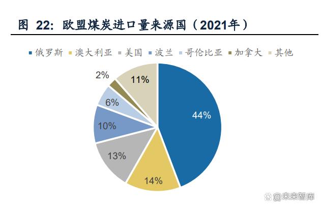 歐盟化石能源進口高度依賴俄羅斯,2021年歐盟煤炭、天然氣進口量中分別44%、 41%來自俄羅斯,俄烏沖突導致歐洲面臨能源價格和供應(yīng)的雙重危機。長遠來看, 歐盟實現(xiàn)能源獨立將從兩方面著手:一是多元化進口天然氣氣源,二是加速能源轉(zhuǎn) 型,提高能效,減少對化石能源的依賴,歐盟對煤炭的需求或?qū)⒊掷m(xù)下降。 煤炭:歐盟的煤炭供給量逐年下降至2021年的4.87億噸,較2000年的8.31億噸減少 41.4%,同時同步減少煤炭本土產(chǎn)量和進口量,對外依存度保持在20%~25%。從煤 炭進口來源看,歐盟煤炭前三大進口國是俄羅斯(占比44%)、澳大利亞(占比14%)、 美國(占比13%);德國和波蘭為本土的產(chǎn)煤大國,合計產(chǎn)量占歐盟總產(chǎn)量的70%。