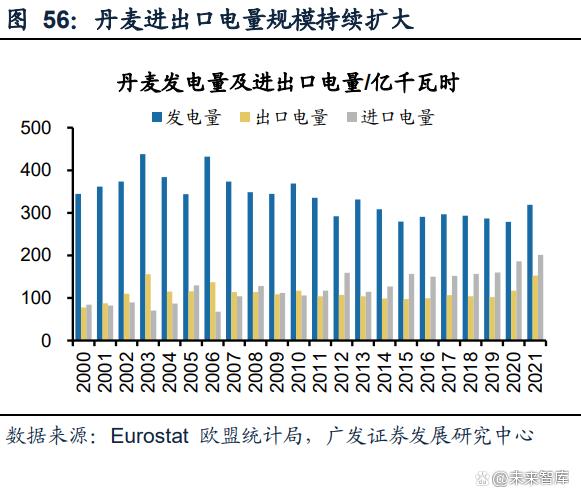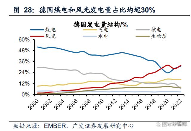 (1)丹麥,以煤為主到以風(fēng)光為主:2000年煤電發(fā)電量占比超40%,2022年降至 10.5%,風(fēng)光發(fā)電量占比已超60%,生物質(zhì)發(fā)電占比23%,丹麥主要依靠與鄰國(guó)電網(wǎng) 互聯(lián),挪威和瑞典均是水電富余國(guó)家,通過(guò)電量進(jìn)出口調(diào)節(jié)國(guó)內(nèi)電量消納,所以風(fēng) 光占比高仍然沒(méi)有出現(xiàn)消納問(wèn)題;