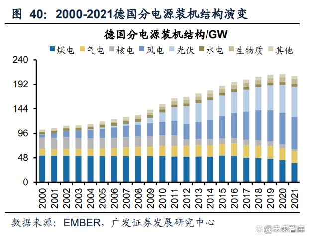 新能源滲透率提升的同時(shí),德國(guó)保留一定火電裝機(jī)用于調(diào)峰。與丹麥不同,德國(guó)在 風(fēng)光發(fā)電量提升的同時(shí),始終保留一定的煤電、并新增一批氣電裝機(jī)解決風(fēng)光消納 問(wèn)題,這與德國(guó)資源稟賦有關(guān),德國(guó)是歐盟最大的煤炭產(chǎn)出國(guó),2021年德國(guó)煤炭產(chǎn)量占?xì)W盟的38%,這與我國(guó)頗為相似。2000-2021年德國(guó)煤電和氣電裝機(jī)占比從63.3% 降低至29.2%,風(fēng)光裝機(jī)占比從6.0%提升至58.7%,新增裝機(jī)主要由風(fēng)光貢獻(xiàn)。發(fā)電 量結(jié)構(gòu)來(lái)看,2000-2021年德國(guó)煤電和氣電發(fā)電量占比從61.0%降低至44.6%,風(fēng)光 發(fā)電量占比從1.6%提升至28.2%,火電仍然保持了一定比例用于調(diào)峰。