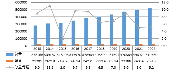 2022年,全國電網(wǎng)220千伏及以上變電設(shè)備容量共51.98億千伏安,同比增長5.2%;220千伏及以上輸電線路回路長度共88.2萬千米,同比增長4.6%。