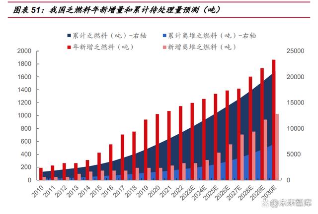 我們根據(jù)目前已公布的在運(yùn)、在建以及核準(zhǔn)待建核電機(jī)組規(guī)模進(jìn)行估算,2025 當(dāng)年將產(chǎn)生 1330 噸乏燃料,累計(jì)乏燃料貯存量達(dá) 13099 噸;2030 年當(dāng)年將產(chǎn)生 1883 噸乏燃料,累計(jì) 21254 噸,考慮堆內(nèi)貯存池 10 年臨時貯存規(guī)模,2025 年、 2030 年新產(chǎn)生的離堆乏燃料分別為 426 噸、1024 噸;累計(jì)需要被處理的離堆乏燃 料分別達(dá)到 3121 噸、7095 噸。綜上,2030 年前國內(nèi)需建成具備年處理能力達(dá)到千 噸以上規(guī)模的乏燃料后處理廠,目前僅 60 噸/年。