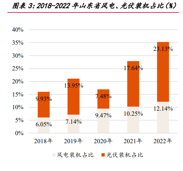 在新能源占比較高的地區(qū),相應(yīng)時(shí)段電價(jià)較低。由于新能源發(fā)電邊際成本低的特 質(zhì),在新能源高發(fā)期間,如果用電需求較低,則相應(yīng)時(shí)段市場(chǎng)電價(jià)較低。以山東省電 力現(xiàn)貨市場(chǎng)為例: 2018-2022 年,山東省風(fēng)電、光伏裝機(jī)容量及發(fā)電量持續(xù)增長(zhǎng),風(fēng)電、光伏裝機(jī) 容量自 1146/1361 萬千瓦增長(zhǎng)至 2302/4270 萬千瓦,CAGR 達(dá) 14.97%/25.69%,風(fēng)電、 光伏裝機(jī)占總裝機(jī)量比例自 6.05%/9.93%擴(kuò)張至 12.14%/23.13%;風(fēng)電、光伏發(fā)電量 占總發(fā)電量比例自 2.32%/0.55%擴(kuò)張至 5.28%/11.25%。