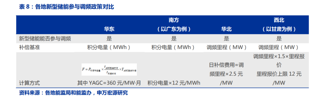 調(diào)頻輔助服務(wù)經(jīng)常因其名稱而讓人迷惑,但調(diào)頻輔助服務(wù)本質(zhì)上還是對(duì)電能量的調(diào)節(jié)。 調(diào)頻輔助服務(wù)理論上就是為了彌補(bǔ)調(diào)頻輔助服務(wù)是為了彌補(bǔ)電力市場(chǎng)和調(diào)峰輔助服務(wù)無法 解決的實(shí)時(shí)平衡問題,主要依靠自動(dòng)控制技術(shù)來進(jìn)行調(diào)整。 調(diào)頻已經(jīng)成為儲(chǔ)能的重要收入來源之一。各地陸續(xù)允許新型儲(chǔ)能參與調(diào)頻輔助服務(wù)市 場(chǎng),而目前在多數(shù)地區(qū),調(diào)頻輔助服務(wù)已經(jīng)成為儲(chǔ)能最重要的收益來源。對(duì)于調(diào)頻輔助補(bǔ) 償基準(zhǔn),華東和南方區(qū)域采用積分電量(即調(diào)頻容量乘以調(diào)用時(shí)間),而華北和甘肅則采 用調(diào)頻里程(即調(diào)頻容量乘以調(diào)用次數(shù))。調(diào)頻補(bǔ)償?shù)挠?jì)算方式并不重要,重要的是看新型儲(chǔ)能參與調(diào)頻輔助服務(wù)相比于火電等傳統(tǒng)機(jī)組是否存在優(yōu)勢(shì)。華東、南方區(qū)域儲(chǔ)能與火 電相比,補(bǔ)償計(jì)算方式?jīng)]有任何區(qū)別。華北區(qū)域同等調(diào)頻里程情況下,儲(chǔ)能的補(bǔ)償費(fèi)用僅 有火電的一半。而對(duì)于甘肅省,補(bǔ)償費(fèi)用則高于火電。