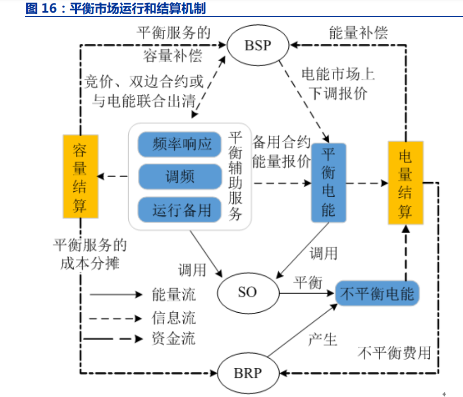 歐洲的平衡市場源于 2017 年 12 月 23 日歐盟委員會(huì) EB 條例,該條例給出一個(gè)指導(dǎo) 方針,使得各國可以在平衡市場中共享資源,從而使發(fā)電量始終與用電量相等。從實(shí)際達(dá) 成的效果來看,歐洲平衡市場與我國的調(diào)頻輔助服務(wù)類似。 在平衡市場中,調(diào)度智能歸于 TSO 或者 DSO,參與平衡市場運(yùn)行和結(jié)算的市場成員 包括 BSP(BalanceServiceProvider,BSP)和 BRP(BalanceResponsibilityParty,BRP) 等。其中 BSP 提供平衡資源,在實(shí)際運(yùn)行中根據(jù)系統(tǒng)頻率變化或調(diào)度指令改變自身出力以 幫助系統(tǒng)恢復(fù)平衡,BRP 是承擔(dān)責(zé)任并參與不平衡結(jié)算的市場成員。