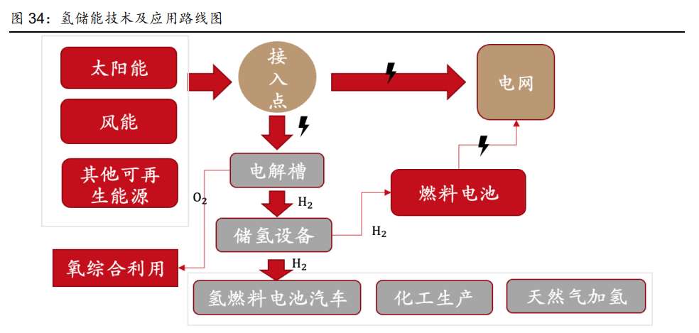 與其他儲能方式相比,氫能更能滿足大規(guī)模、長時間消納需求。與抽水儲能、鋰電池儲能 等方式相比,其具有邊際成本低、能量密度大、無自衰減等優(yōu)勢,能夠?qū)崿F(xiàn)跨周、跨季儲 能。但其實(shí)際應(yīng)用需要經(jīng)過光伏發(fā)電到制氫再由儲氫發(fā)電的兩次轉(zhuǎn)換,短期內(nèi)儲能效率較 低。鋰電儲能的效率更高,適用于日度調(diào)峰;氫能更針對于大規(guī)模儲能和季度調(diào)峰,擴(kuò)容 只需要增加儲氫設(shè)備,邊際成本更低。
