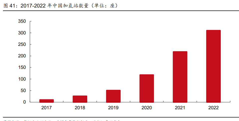 加氫站布局加快,逐漸形成網(wǎng)絡(luò)。加氫站等基礎(chǔ)設(shè)施是否完善是影響消費(fèi)者購買氫燃料電 池汽車熱情的主要因素。隨著國內(nèi)氫燃料電池汽車?yán)塾?jì)銷量增加,中石化、中石油等能源 央企不斷加大加氫基礎(chǔ)設(shè)施的投資和建設(shè)力度,國內(nèi)加氫站數(shù)量呈現(xiàn)快速增長趨勢。截至 2022 年底,我國加氫站累計(jì)建成數(shù)量達(dá)到 274 座。根據(jù) 2020 年中國汽車工程學(xué)會發(fā)布 的《節(jié)能與新能源汽車技術(shù)路線圖 2.0》相關(guān)規(guī)劃,到 2035 年加氫站的建設(shè)目標(biāo)為至少 5000 座,中國未來加氫基礎(chǔ)設(shè)施的市場規(guī)模在 2030-2050 年將突破千億。此外,我國加 氫站建設(shè)參與主體呈現(xiàn)多樣化趨勢,采取規(guī)?;ㄔO(shè)或加油/加氫/加氣站合建等方式來拓 展加氫基礎(chǔ)設(shè)施網(wǎng)絡(luò),單位加注成本也有望下降。