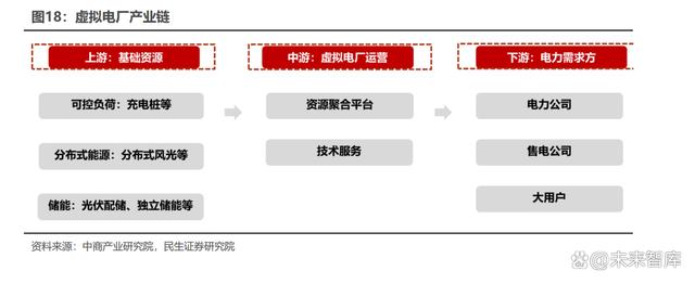 虛擬電廠產(chǎn)業(yè)鏈包括:上游基礎資源、中游虛擬電廠運營、下游電力需求方。 上游基礎資源由可控負荷、分布式能源與儲能構(gòu)成;中游是提供運營服務與技術支 持的虛擬電廠運營平臺;下游則由電力公司、售電公司、工業(yè)企業(yè)、商業(yè)用戶等電 力需求方構(gòu)成。