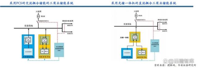 商業(yè)儲能系統(tǒng)架構(gòu)主要有兩種:1)采用 PCS 的交流耦合型;2)采用光儲一體機的直流耦合型。交流耦合系統(tǒng)與儲能電站的系統(tǒng)配置類似,但相對用量較小,系統(tǒng)功能也更為簡單,其中的光伏系統(tǒng)和儲能系統(tǒng)并聯(lián),靈活性較高,適用于已安裝工商業(yè)光伏的存量市場。直流耦合系統(tǒng)通過光儲一體機將光伏逆變器和雙向變流器整合在一起,相比交流耦合系統(tǒng)具有高度集成化、軟性成本低的特點,50-100kW 的光儲一體機已逐漸成為中小工商業(yè)儲能系統(tǒng)的選擇。