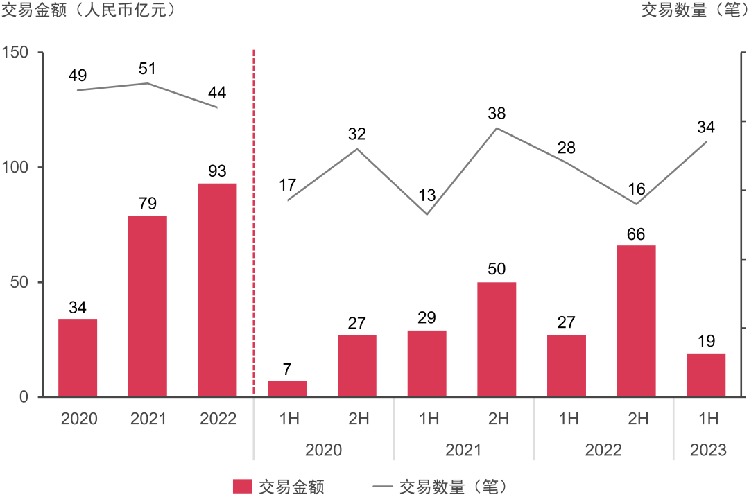 2020年至2023年上半年風(fēng)電及光伏產(chǎn)業(yè)鏈并購交易數(shù)量及金額