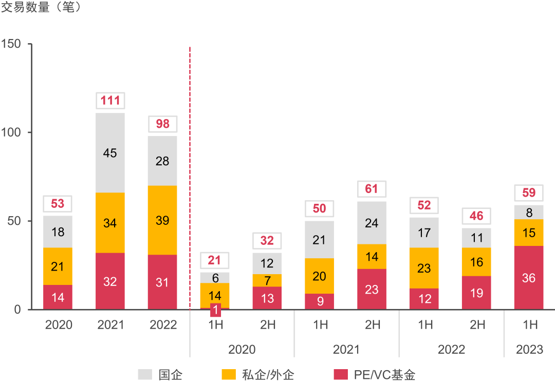 國企整體投資熱度有所下降,上半年僅有兩筆交易;顯示出國企對于行業(yè)成熟度提高后的投資謹(jǐn)慎性。