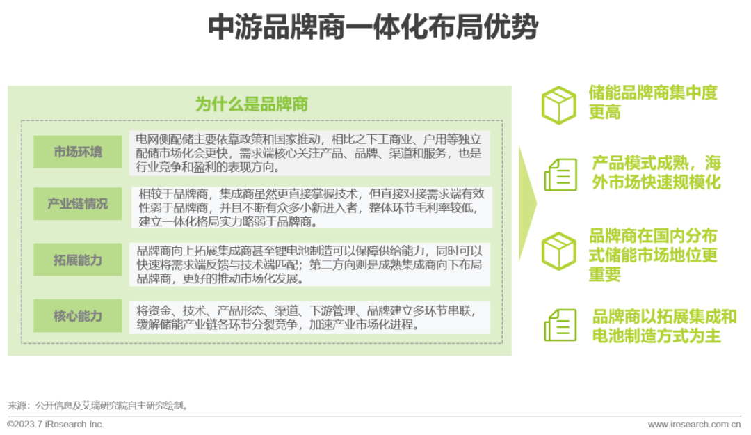 行業(yè)的發(fā)展終究要以市場為主,玩家把握市場端的打法也是產(chǎn)業(yè)逐漸成熟化的標志。品牌商作為鏈接制造端和市場端的核心環(huán)節(jié),直接將上端集成產(chǎn)品通過設(shè)計開發(fā)及管理對標售賣給下游B、C端客戶,然后搭配一系列的供應(yīng)渠道、售后服務(wù)等實現(xiàn)商業(yè)化發(fā)展。未來的資本認可度會逐步增高。以品牌商為核心想向產(chǎn)業(yè)鏈上下游布局會成為行業(yè)集中化發(fā)展的主要形態(tài)。