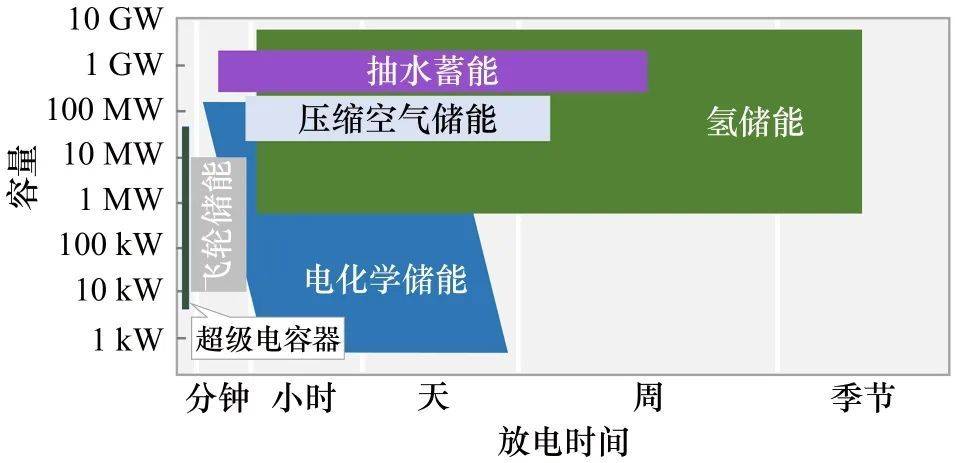 ?、僭谛履茉聪{方面,氫儲(chǔ)能在放電時(shí)間(小時(shí)至季度)和容量規(guī)模(百吉瓦級(jí)別)上的優(yōu)勢(shì)比其他儲(chǔ)能明顯,如圖1所示;