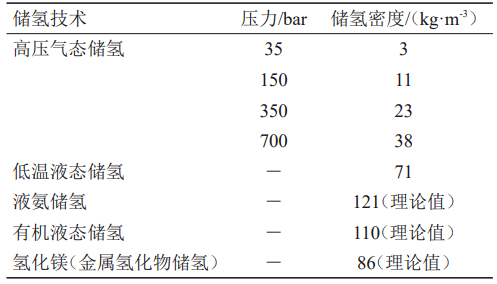 表2 不同儲(chǔ)氫技術(shù)的密度