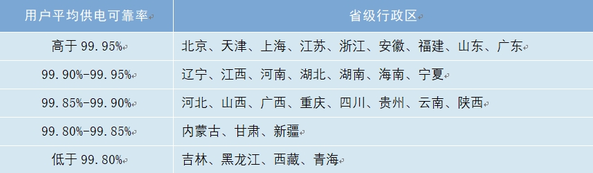 2023年,全國31個(gè)省級(jí)行政區(qū)中,北京、上海、廣東、天津、江蘇、浙江、安徽、福建、山東的用戶平均供電可靠率高于99.95%,內(nèi)蒙古、吉林、黑龍江、西藏、甘肅、青海、新疆的用戶平均供電可靠率低于99.85%。
