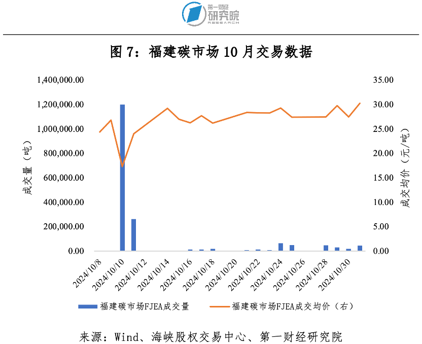 10月福建碳市場(chǎng)碳排放配額(FJEA)成交量180.49萬噸,成交額3677.71萬元。10月最后一個(gè)交易日收盤價(jià)30.25元/噸,較9月最后一個(gè)交易日收盤價(jià)27.11元/噸上漲11.58%。