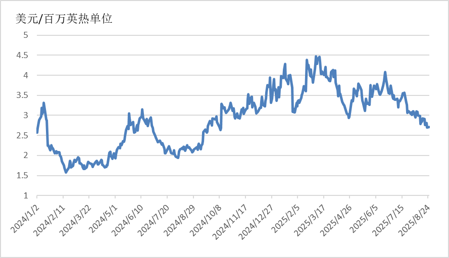 截至8月25日,美國(guó)Henry Hub天然氣主力合約收于2.709美元/百萬(wàn)英熱單位,月環(huán)比下降12.47%,相較于2024年同期的2.12美元/百萬(wàn)英熱單位,上漲27.78%。